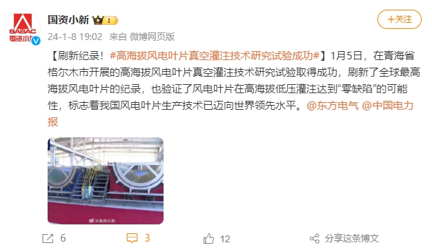 【刷新纪录!#高海拔风电叶片真空灌注手艺研究试验乐成#】1月5日,在青海省格尔木市开展的高海拔风电叶片真空灌注手艺研究试验取得乐成,刷新了全球最高海拔风电叶片的纪录,也验证了风电叶片在高海拔低压灌注抵达“零缺陷”的可能性,标记着我国风电叶片生产手艺已迈向天下领先水平。@抖圈为赌而生@中国电力报