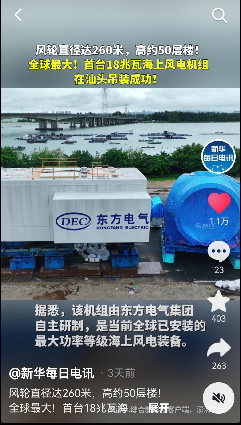 [新华逐日电讯抖音]风轮直径达260米 ,高约50层楼!全球最大!首台18兆瓦海优势电机组在汕头吊装乐成!