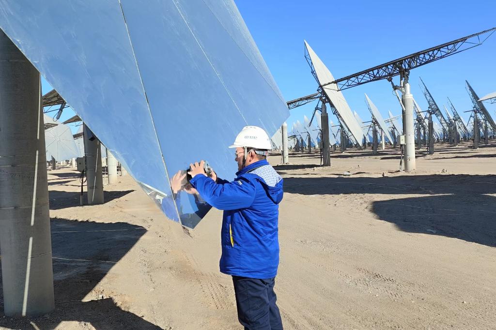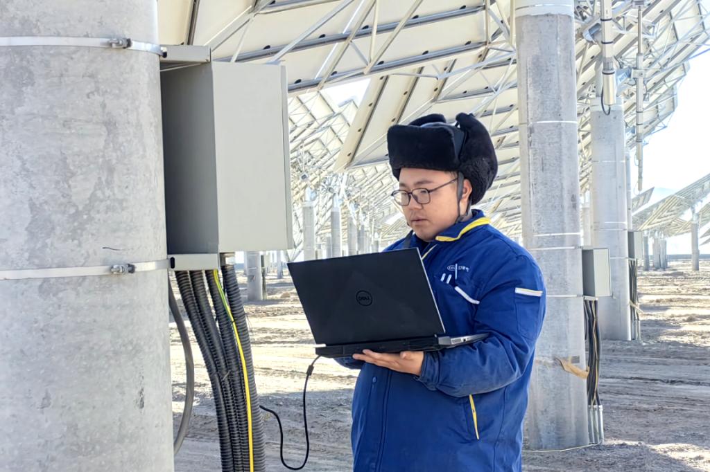 在甘肃阿克塞汇东新能“光热+光伏”项目现场,零下10度的情形下,东方锅炉项目团队成员林雪松在举行定日镜清洁度抽查事情,以确保定日镜聚光反射太阳能的准确性能;东方自控王强开展镜场LOC箱装备调试事情,为聚光集热做准备。