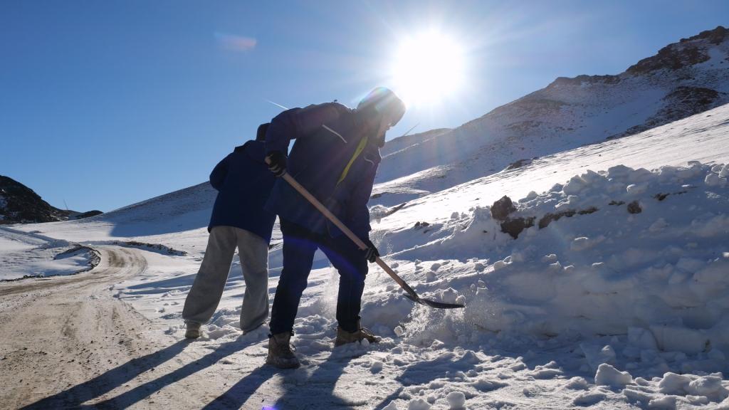 在位于新疆木垒哈萨克自治县东南部的抖圈为赌而生木垒100万千瓦风电项目现场,零下12度的情形下,东方风电木垒项目团队成员罗宇轩、黄昌毅先后在整理机舱内和路面的积雪,流通运输蹊径,为风机吊装做好准备,全力推动项目年内建成投运。