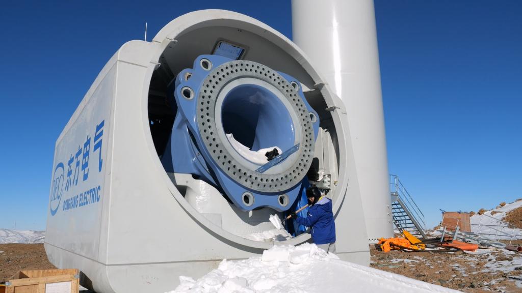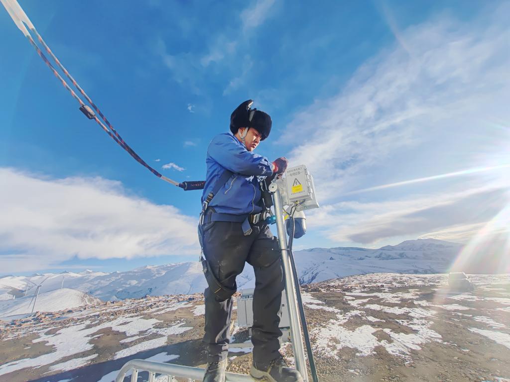 在位于喜马拉雅山北麓的西藏日喀则市萨迦县的萨迦风场,零下6度的情形下,东方风电安调员益西曲培正顶着寒风在塔基装置风机摄像头。
