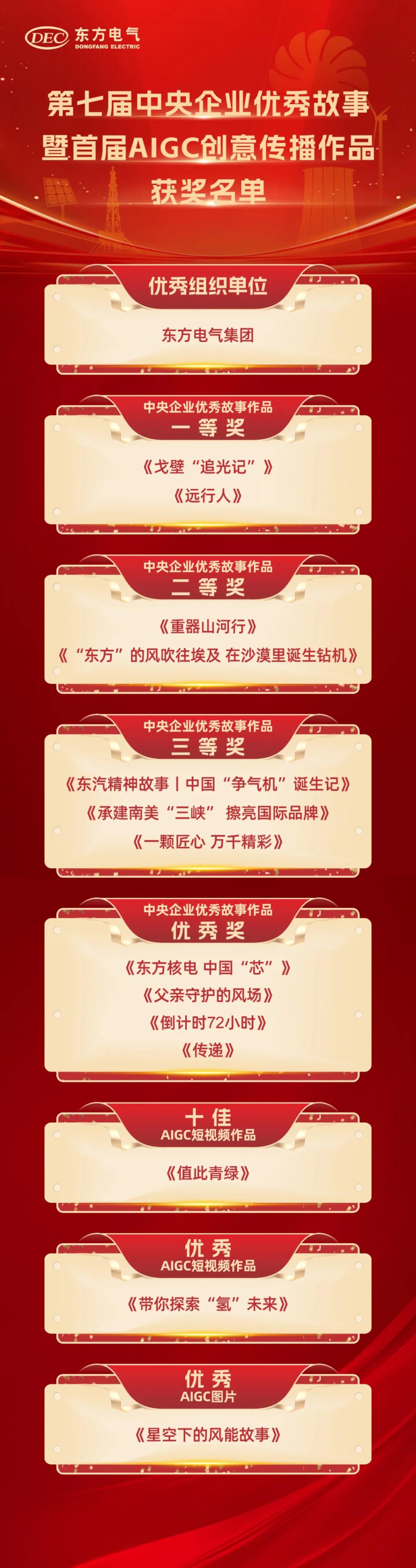 其中,《沙漠“追光记”》《远行人》荣获中央企业优异故事作品一等奖,《重器山河行》《“东方”的风吹往埃及 在沙漠里降生钻机》荣获中央企业优异故事作品二等奖,《东汽精神故事丨中国“争气机”降生记》《承建南美“三峡”擦亮国际品牌》《一颗匠心 万千精彩》荣获中央企业优异故事作品三等奖,《东方核电 中国“芯”》《父亲守护的风场》《倒计时72小时》《转达》荣获中央企业优异故事作品优异奖,《值此青绿》获评十佳AIGC短视频作品,《带你探索“氢”未来》获评优异AIGC短视频作品,《星空下的风能故事》获评优异AIGC图片。